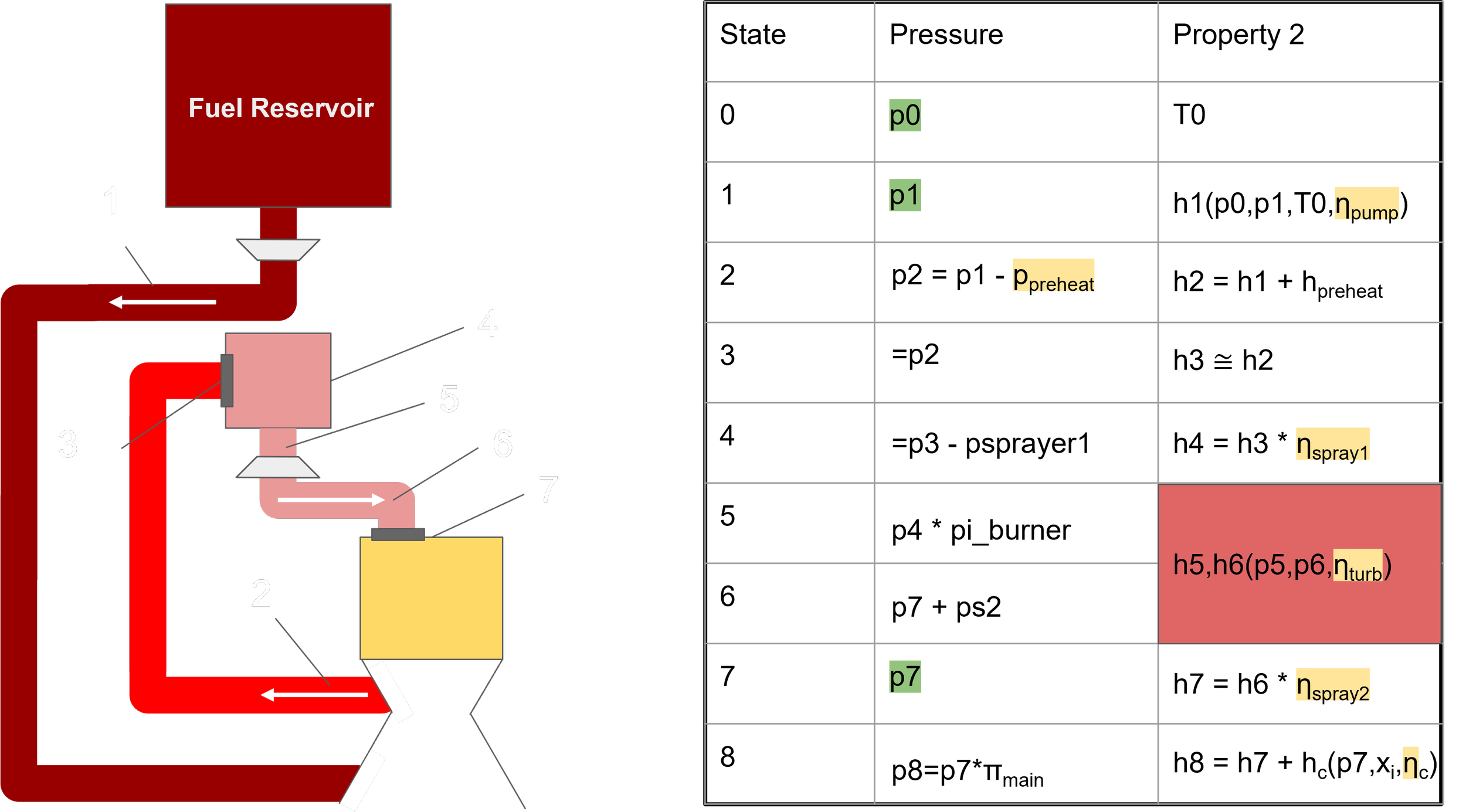 This was done by assigning assumed efficiencies to fuel pumps, pre-burners and turbines, and using the CoolProp python package to approximate the thermodynamic states of the engine fluid.